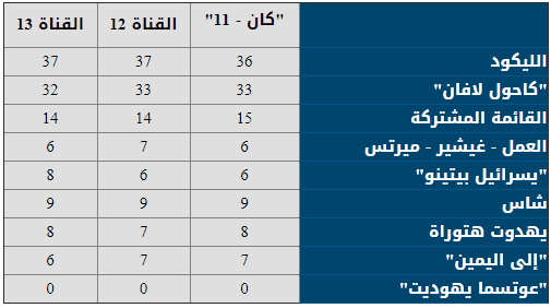 وجاءت نتائج استطلاعات الرأي في القنوات الإسرائيلية على النحو التالي: