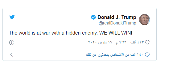 وكتب ترامب على حسابه الرسمي على موقع "تويتر": "العالم الآن في حال حرب مع عدو خفي. سوف ننتصر".