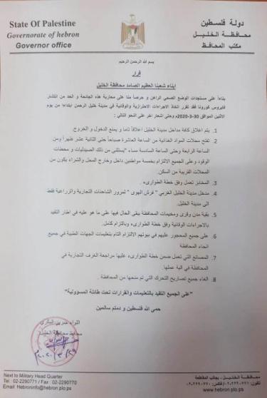 وجاء في بيان أصدره المحافظ، "إنه بناء على مستجدات الوضع الصحي الراهن وحرصا منا على محاربة هذه الجائحة، والحد من انتشار فيروس كورونا، فقد تقرر اتخاذ الإجراءات الاحترازية والوقائية في مدينة خليل الرحمن ابتداء من يوم الاثنين الموافق 30-3-2020 وحتى إشعار آخر، على النحو التالي:
