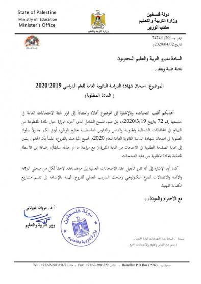 وكانت وزارة التربية والتعليم اعلنت أن تاريخ انطلاق امتحانات الثانوية العامة يبقى في موعده المقرر سلفاً، 31 أيار 2020، إلا إذا اقتضت الضرورة تغيير هذا الموعد.
