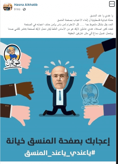 ولقيت الحملة التي تدعوا لإلغاء متابعة صفحة المنسق، وإزالة الإعجاب عنها تفاعلا واسعا من قبل الشارع الفلسطيني على منصتي فيسبوك وتويتر حيث لوحظ انخفاض كبير لعدد المتابعين لصفحة "المنسق".