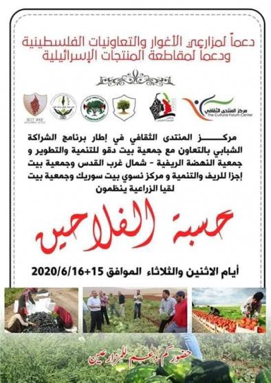 تنطلق ظهر اليوم وتستمر غدا في منطقة شمال غرب القدس وتحديدا في قرية بيت عنان حسبة الفلاحين بهدف مشاركة واسناد المزارعين ومنتجاتهم من الاغوار ومن التعاونيات الزراعية من منطقة نابلس ومزارعي قرى شمال غرب القدس.