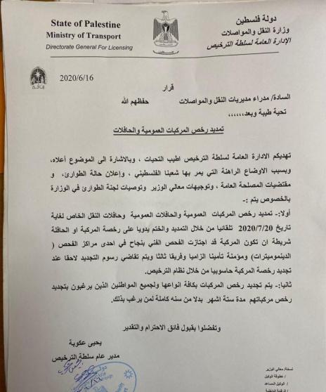 اصدرت وزارة النقل والمواصلات قرارا بتمديد سريان رخص المركبات العمومية والحافلات بسبب الظروف الراهنة في البلاد.
