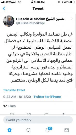 دعا الوزير حسين الشيخ عضو اللجنة المركزية لحركة فتح فصائل منظمة التحرير وحركتي حماس والجهاد الاسلامي للشروع الفوري لرسم استراتيجية وطنية شاملة لحماية المشروع الوطني.