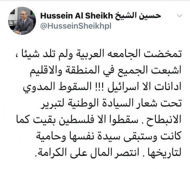 عقب حسين الشيخ، عضو اللجنة المركزية لحركة فتح، على اسقاط جامعة الدول العربية، مشروع قرار فلسطيني لإدانة اتفاق التطبيع بين دولة الامارات والاحتلال الاسرائيلي.