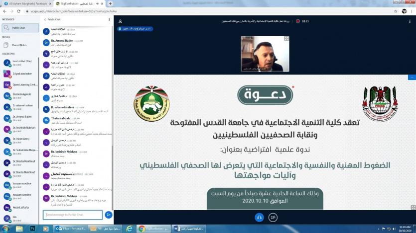 عقدت كلية التنمية الاجتماعية والأسرية في جامعة القدس المفتوحة، ونقابة الصحفيين الفلسطينيين، يوم السبت الموافق 10-10-2020م، ندوة علمية افتراضية بعنوان "الضغوط المهنية والنفسية والاجتماعية التي يتعرض لها الصحفي الفلسطيني وآليات مواجهتها".