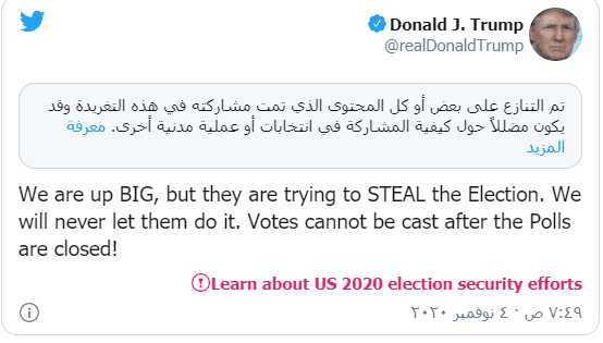 قالت شركة تويتر أن تغريدة الرئيس دونالد ترامب التي زعم فيها أن هناك محاولة "لسرقة الانتخابات" قد تكون مضللة.