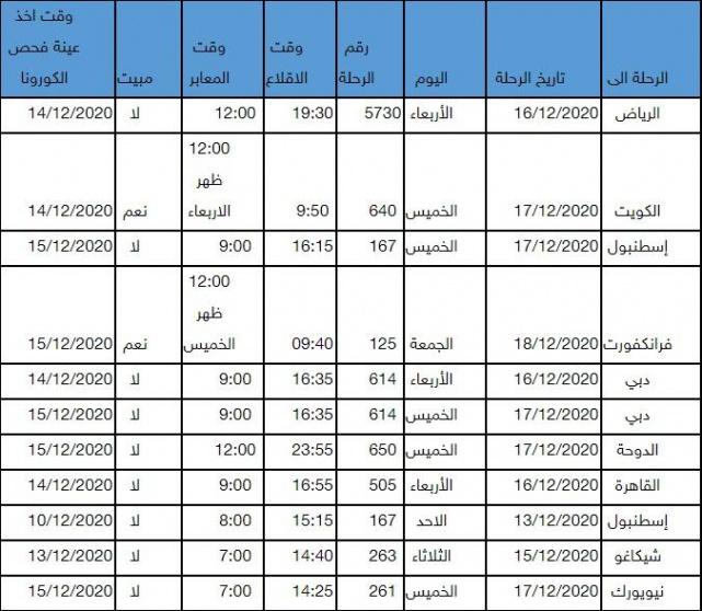 ودعت الخارجية في بيان صحفي اليوم الخميس، جميع الذين سجلوا في هذه الفترة والفترة من 28/11/2020 ولغاية 30/11/2020 وتبلغوا بحصولهم على الموافقات اللازمة، المباشرة بالحجز وشراء التذاكر على متن رحلات الملكية كما هو موضح في الجدول التالي، عبر نظام الحجز الالكتروني ( اضغط هنا ) او عبر وكيل سفرهم المحلي.