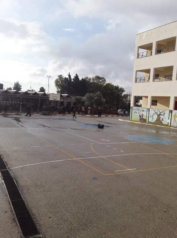 وذكرت مصادر محلية، أن قوات الاحتلال أطلقت القنابل المسيلة للدموع داخل ساحة المدرسة، ما أدى الى إصابة عشرات الطلبة والمعلمين بحالات اختناق، وهلع، وعمل عدد من المعلمين على تقديم الإسعافات الأولية لهم، عدا عن الفوضى التي تسببت بها، ما أثر على سير العملية التعليمية.