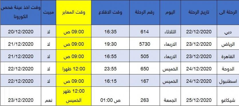 ودعت "الخارجية" جميع من سجلوا لديها في هذه الفترة، إضافة إلى من سجلوا في الفترات من 10/12/2020 الى 12/12/2020، ومن 03/12/2020 الى 05/12/2020، عبر المنصة الالكترونية، ولم يتمكنوا من السفر على متن الرحلات السابقة، المباشرة بالحجز وشراء التذاكر على متن رحلات الملكية كما هو موضح في الجدول التالي، عبر نظام الحجز الالكتروني اضغط هنا ، او عبر وكيل سفرهم المحلي، علماً أن هذه الفرصة هي الاخيرة للسفر.