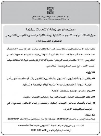 أصدرت لجنة الانتخابات المركزية مساء اليوم الأربعاء، اعلانا مهما حول الفئات الواجب تقديم استقالتها بهدف الترشح لعضوية المجلس التشريعي الفلسطيني، في الانتخابات المقبلة 2021.