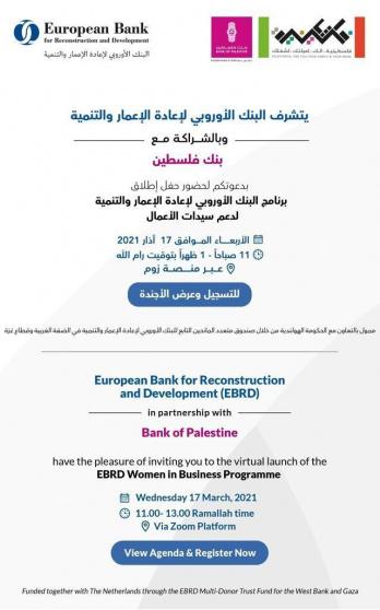 يُطلق البنك الأوروبي لإعادة الإعمار والتنمية، وبالشراكة مع بنك فلسطين، يوم الأربعاء القادم ، برنامجه لدعم سيدات الأعمال في الضفة الغربية وقطاع غزة.