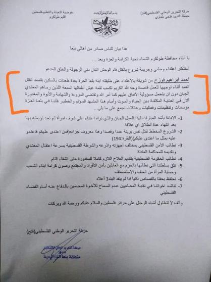3 - نطالب الأمن الفلسطيني بمختلف أجهزته واذرعه والشرطة الفلسطينية بسرعة اعتقال المعتدي وتقديمه للمحاكمة العادلة.