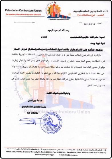 أكد اتحاد المقاولين الفلسطينيين بالمحافظات الجنوبية "قطاع غزة" على قرار مقاطعة شراء العطاءات وجميع الممارسات واستدراج عروض الأسعار.