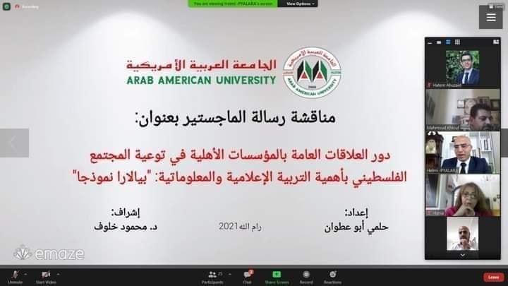 وحضر النقاش الذي تم عبر تقنية "زوم"؛ مساعد رئيس الجامعة للشؤون المجتمعية د. إياد دلبح، ورئيس قسم العلاقات العامة المعاصرة في الجامعة د. حسين الأحمد، وعميد كلية الإعلام في جامعة القدس المفتوحة د. شادي أبو عياش، وعميد كلية الإعلام بجامعة الأقصى في قطاع غزة د. أحمد مغاري، والسيدة هانيا البيطار؛ المديرة العامة لمؤسسة بيالارا، وسط حضور ذوي الطالب ومجموعة من طلبة البرنامج.