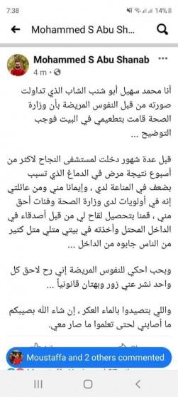 وقال الشاب: "أنا محمد سهيل أبو شنب الشاب الذي تداولت صورته من قبل النفوس المريضة بأن وزارة الصحة قامت بتطعيمي في البيت فوجب التوضيح".