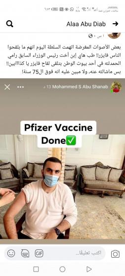 ورد الشاب محمد سهيل أبو شنب اليوم الثلاثاء، على الاتهامات التي وجهت له عبر وسائل التواصل الاجتماعي بتلقيه لقاح "فايزر" المضاد لفيروس كورونا، دون وجه حق وقبل الفئات المحددة.