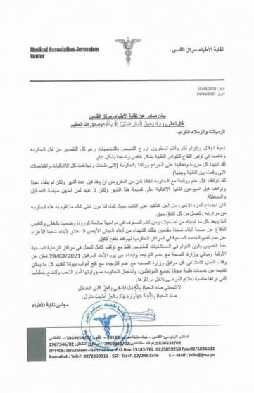 وأشارت نقابة الأطباء في بيان صحفيوصل لـ "راية" أنه وابتداءً من يوم الأحد المقبل 28- 3- 2021، يتم وقت العمل كاملا في كل مرافق وزارة الصحة مع عدم التوجه، مع فتح أبواب البيوت لتقديم الخدمات الطبية مجانا لجميع المواطنين.