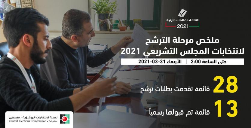 أعلنت لجنة الانتخابات المركزية أن 28 قائمة انتخابية تقدمت بطلبات ترشح لانتخابات المجلس التشريعي 2021 منذ بداية عملية الترشح وحتى ظهر اليوم الأربعاء.