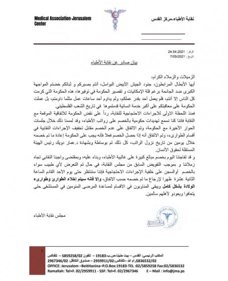 وجاء في البيان: "منذ اللحظة الاولى للإجراءات الاحتجاجية للنقابة، رداً على نقض الحكومة للاتفاقية الموقعة مع النقابة فإننا كنا نسمع تهديدات حكومية بالخصم على رواتب الأطباء، وقد لمسنا ذلك خلال جلسات الحوار الأخيرة مع الحكومة، وتم الاتفاق على عدم الخصم مقابل تخفيف الإجراءات النقابية في أقسام الطوارئ، وتم الاتفاق أنه إذا حصل الخصم فعلا فأنه يجب على الحكومة إعادة ما تم خصمه خلال يومين من تاريخ نزول الراتب، كل ذلك تم بوساطة وبشهادة د. عمار دويك رئيس الهيئة المستقلة لحقوق الأنسان."