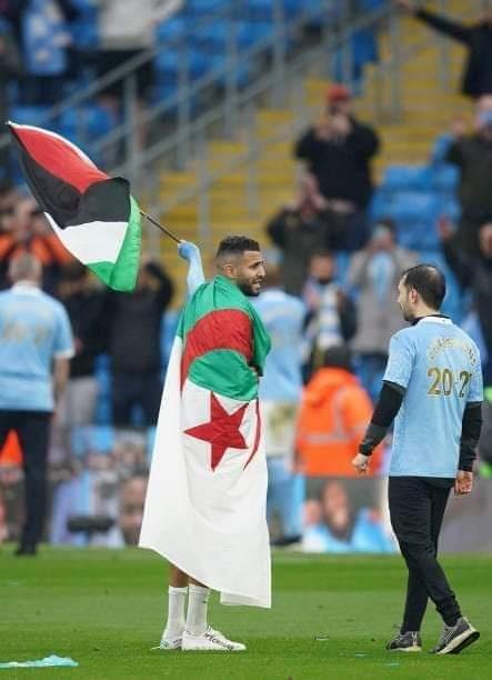 رفع النجم الدولي الجزائري رياض محرز، مساء الأحد، علمي فلسطين والجزائر في احتفالات تتويج فريقه مانشستر سيتي بلقب الدوري الانجليزي (البريمرليغ).