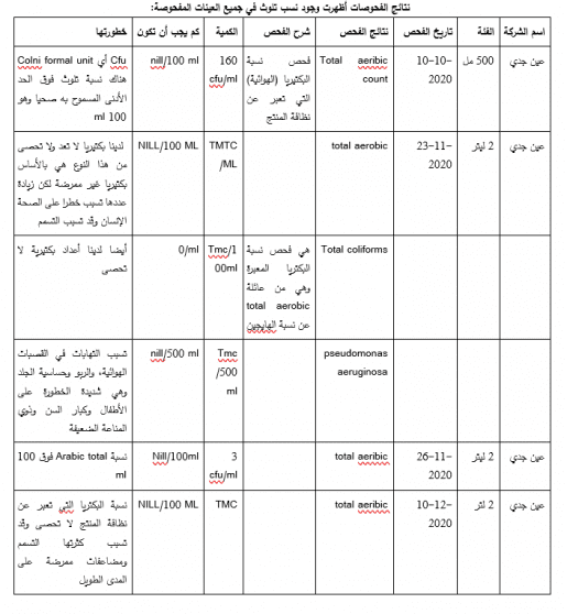 وتشير إلى أن سبب تلوث عبوات المياه المعدنية "هو قلة المتابعة من المصنع نفسه، وقلة الرقابة على الفلاتر وعدم تنظيفها باستمرار، بحيث يستخدم المصنع الفلاتر أكثر من مرة دون مراعاة تعقيمها، إضافة إلى سوء التخزين".