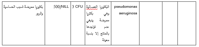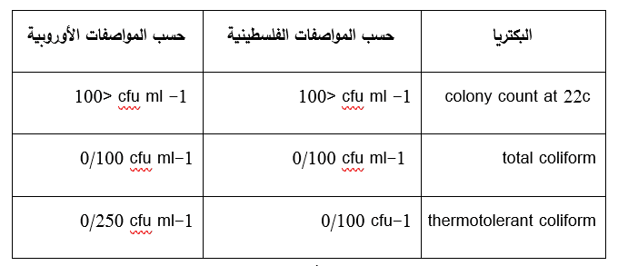 وبحسب المواصفات الفلسطينية والأوروبية، يجب ألا تتعدى نسبة البكتيريا الهوائية 100 مل، فإن زادت عن ذلك يصبح تلوثا. كما أن الحرارة يجب ألا تزيد عن 25 درجة مئوية.
