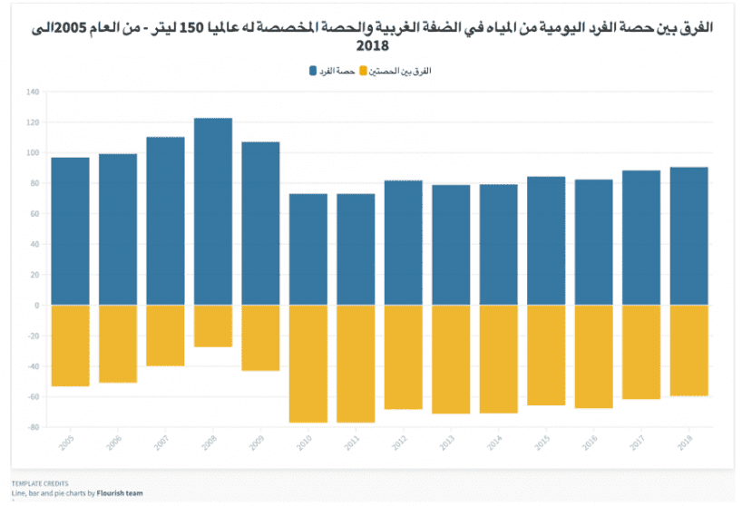 وبحسب تحليل بيانات التقارير الإحصائية الصادرة عن الجهاز المركزي للإحصاء الفلسطيني ومقارنتها بالحصة العالمية، تبيّن أن جميع محافظات الضفة الغربية تعاني عجزاً وشحاً مائياً منذ أكثر من عشرة أعوام، وتحصل على نصيب مائي أقل من الحصة العالمية باستثناء محافظتي أريحا والأغوار.