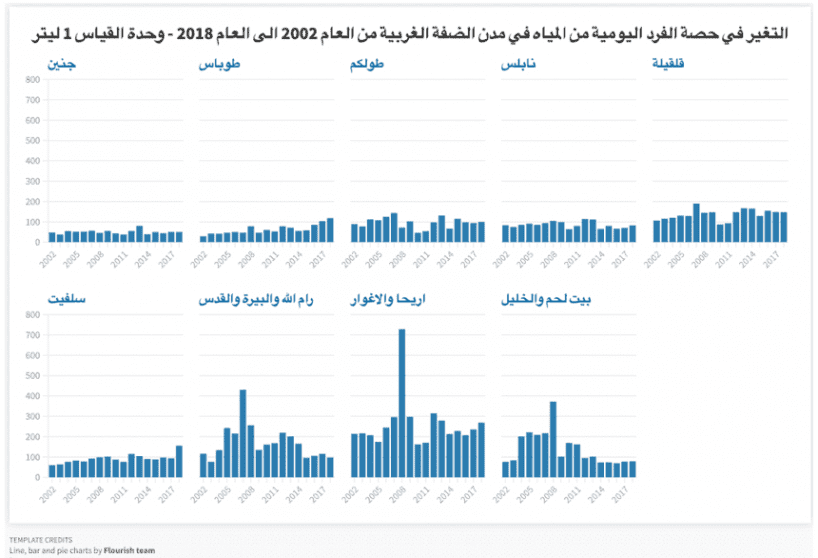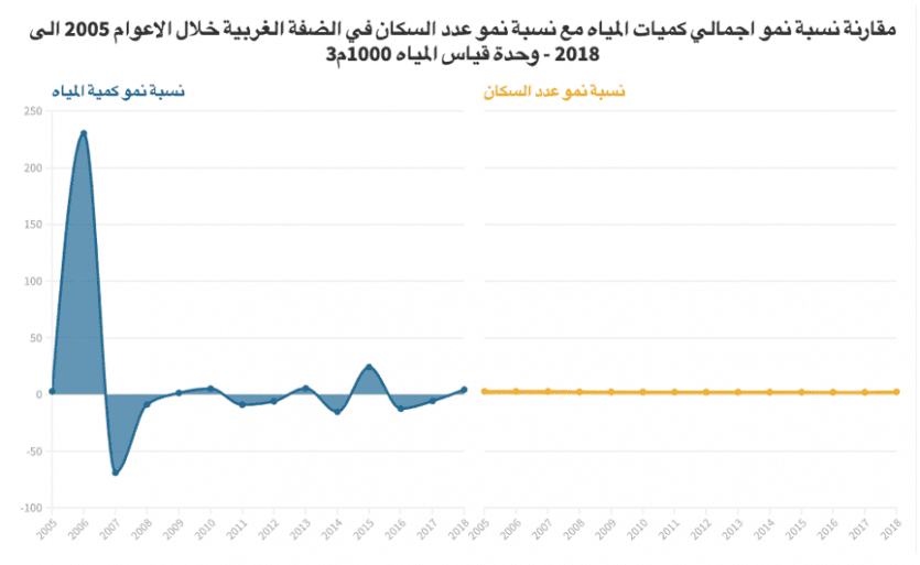 أظهرت نتائج تحليل بيانات الجهاز المركزي للإحصاء الفلسطيني أن نمو المياه في مدن الضفة الغربية كان في تناقص مستمر خلال الأعوام من 2005 إلى 2018 باستثناء العام 2006، بينما لم يزداد عدد السكان بشكل ملحوظ خلال هذه الأعوام.