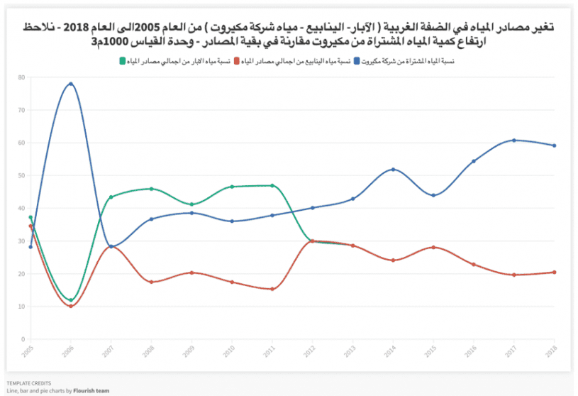 أظهرت نتائج تحليل البيانات أن نسبة المياه المشتراة من شركة "مكوروت" الإسرائيلية كانت في ازدياد خلال الأعوام 2005 إلى 2018 في مدن الضفة الغربية، وفي المقابل تناقصت نسبة مياه الآبار والينابيع، ما جعل مياه شركة "مكوروت" مصدرا أساسيا يشتري منه المواطنون الفلسطينيون المياه في ظل الشح المائي.