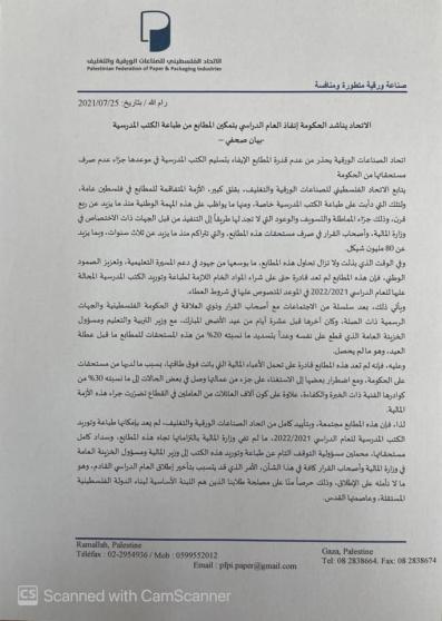 حذّر الاتحاد الفلسطيني للصناعات الورقية والتغليف اليوم الاثنين، من عدم قدرة المطابع الإيفاء بتسليم الكتب المدرسية في موعدها جراء عدم صرف مستحقاتها من الحكومة، مناشدا الأخيرة إنقاذ العام الدراسي بتمكين المطابع من طباعة الكتب.