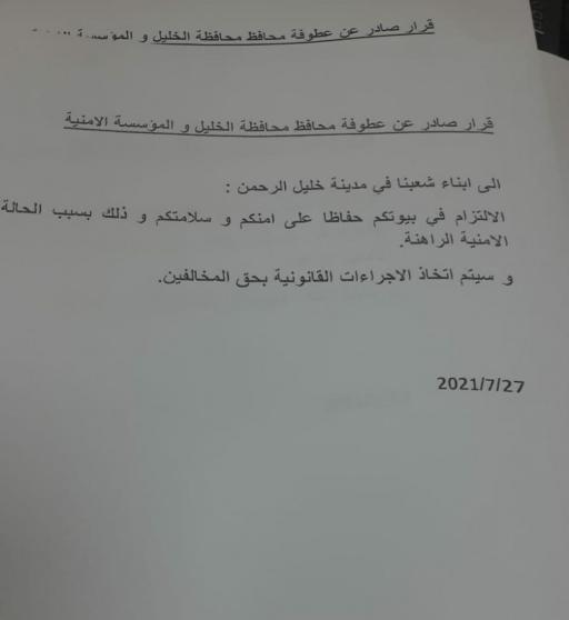 وجاء في القرار: "إلى أبناء شعبنا في مدينة خليل الرحمن، الالتزام في بيوتكم حفاظا على أمنكم وسلامتكم وذلك بسبب الحالة الامنية الراهنة، وسيتم اتخاذ الاجراءات القانونية بحق المخالفين".