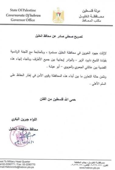 محافظ الخليل: بوادر إيجابية لإنهاء قضية عائلتي الجعبري والعويوي