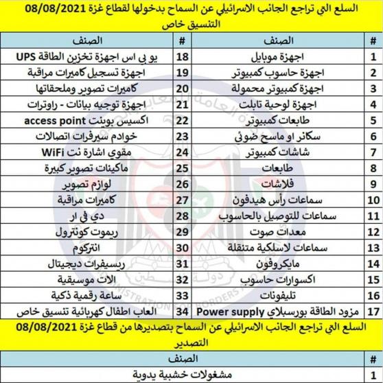 ونشرت اللجنة قائمة السلع التي تراجع الاحتلال عن إدخال لقطاع غزة، مضيفة أن "الجانب الاسرائيلي تراجع عن السماح بإدخال وتصدير بعض السلع والتي قد أعلن عن السماح بدخولها يوم الخميس الماضي".