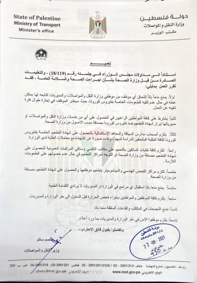 أعلنت وزارة النقل والمواصلات اليوم الأحد، عن مجموعة قرارات وإجراءات جديدة في ظل ارتفاع المنحنى الوبائي الذي تمر به فلسطين حاليا.