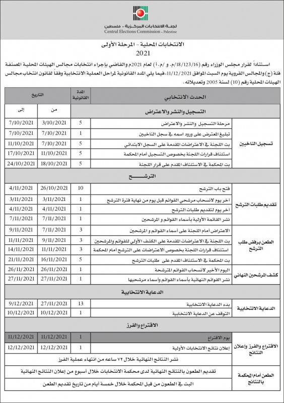 أعلنت لجنة الانتخابات المركزية اليوم الأربعاء، جدول المدد القانونية للانتخابات المحلية 2021 (المرحلة الأولى)، وفقاً لقرار مجلس الوزراء الصادر بتاريخ 6/9/2021 والذي يقضي بعقد المرحلة الأولى من الانتخابات يوم 11 كانون أول المقبل.