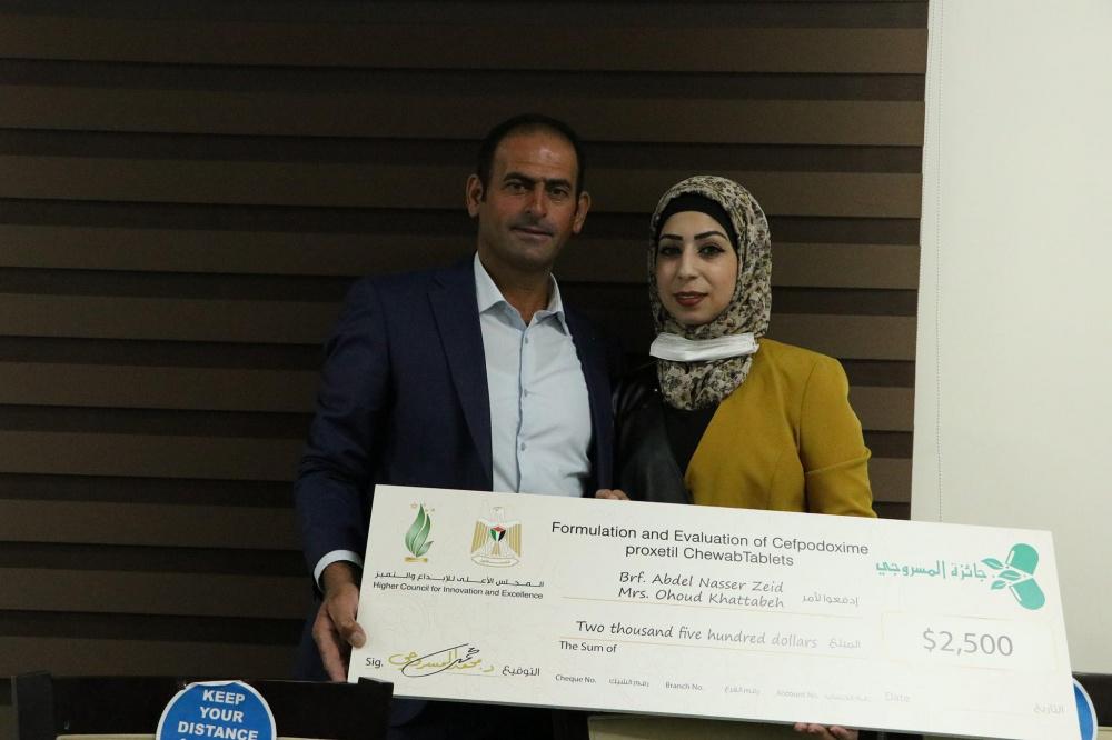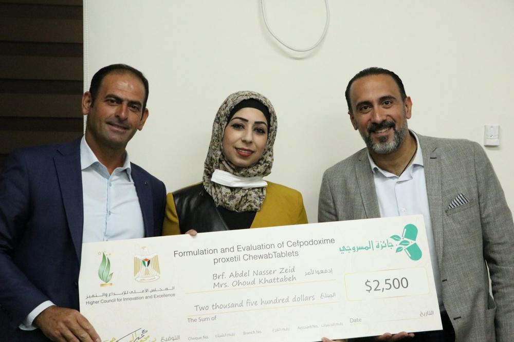 - فيما فاز بالمرتبة الثانية مكرر، وجائزة قيمتها 2500 دولار، د. عهود خطاطبة وأ.د. عبدالناصر زايد ومشروعهما تصنيع وتقييم أقراص سيفبودوكسيم بروكسيتيل للمضغ. وتستهدف كافة الفئات العمرية بما فيها الأطفال والمسنين، حيث أن سيفبودوكسيم بروكسيتيل هو أحد أنواع الجيل الثالث من السيفالوسبورينات، والذي يستخدم بشكل رئيسي في علاج الالتهابات البكتيرية.