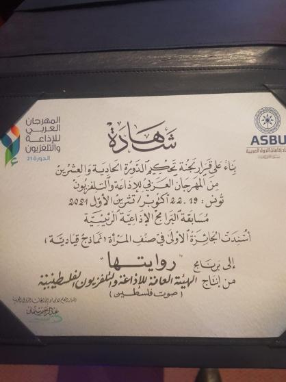 فازت رواية الناشطة النسوية "مريم زقوت" بالمرتبة الاولي في المهرجان العربي للإذاعة والتليفزيون في تونس، ضمن مسابقة البرامج الاذاعية الرئيسية -صنف المرأة نماذج قيادية .