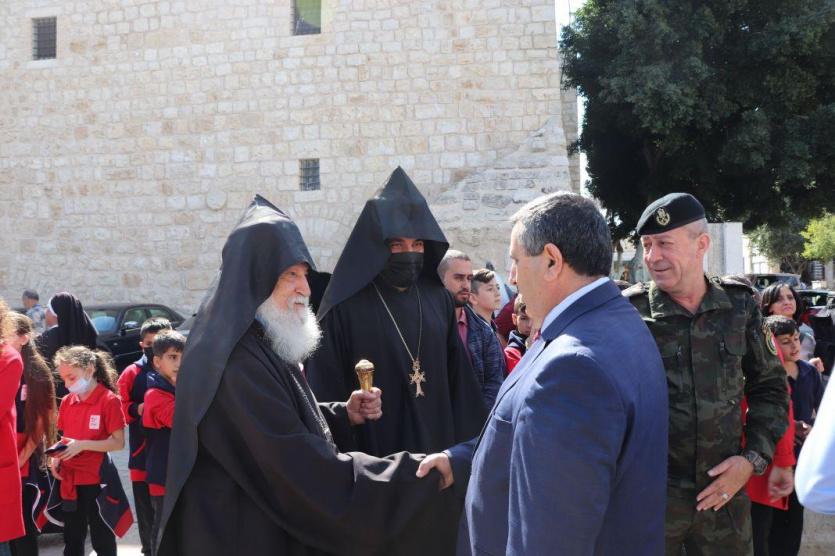 وكان في استقباله على بلاط كنيسة المهد، محافظ بيت لحم كامل حميد، ورئيس بلدية بيت لحم أنطون سلمان، وقائد منطقة بيت لحم العميد ناصر عمر، ومدير عام الشرطة في بيت لحم العميد طارق الحج، ووجهاء من أبناء الرعية.