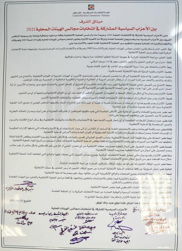 ورحب رئيس لجنة الانتخابات المركزية د. حنا ناصر في كلمته التي سبقت التوقيع بالأمناء العامين وممثلي الأحزاب الفلسطينية، مؤكداً على أهمية هذا الميثاق باعتباره وثيقة ينبع مضمونها من قانون الانتخابات، بحيث يتعهد الموقعون عليها باحترام القانون ومراقبة سلوك القوائم والمرشحين التابعين لهيئاتهم الحزبية، بما يسهم في تعزيز نزاهة الانتخابات.