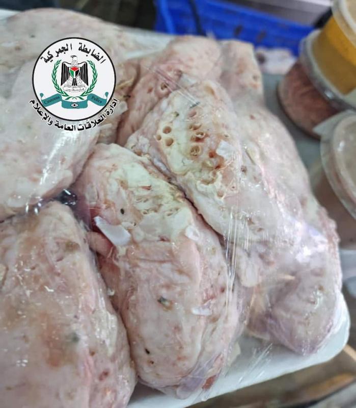ضبط جهاز الضابطة الجمركية، بالتعاون مع لجنة السلامة العامة، اليوم السبت، في محافظة رام الله والبيرة (140) كيلو لحوم دجاج غير صالحة للاستهلاك الآدمي؛ نتيجة لإنبعاث روائح كريهة منها وظهور علامات التلف والعفن عليها.