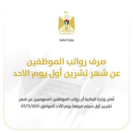 أعلنت وزارة المالية أن رواتب الموظفين العموميين عن شهر تشرين أول/اكتوبر ستصرف يوم الأحد 7/11/2021.
