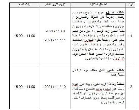 أعلنت شركة كهرباء محافظة القدس، أنه بناءا على قرار شركة كهرباء إسرائيل والمستوى السياسي لديها، فقد قررت قطع التيار الكهربائي عن المناطق الآتية في الأيام المبينة في الجدول من الساعة 11:00 ظهرا الى الساعة 15:00 عصرا.