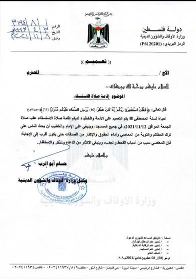 قررت وزارة الأوقاف والشؤون الدينية، إقامة صلاة الاستسقاء يوم الجمعة القادم المواقق 12/11/2021 في جميع المساجد، داعية الخطباء أن يحثوا الناس على ترك المظالم والتوبة من المعاصي وأداء الحقوق.