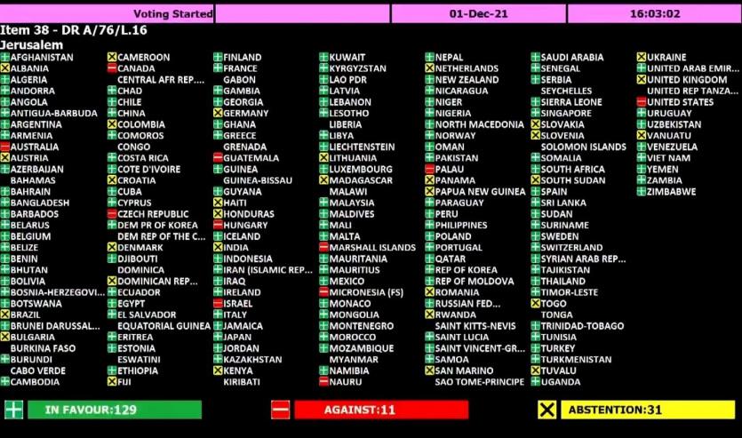 أما القرار المعنون "القدس" أو A/76/L.16 فقد صوت لصالحه 129 عضوا، وعارضه 11 وامتنع عن التصويت 31 عضوا. ويحث هذا القرار الذي قدمت مشروعه مصر أيضا على وقف التحريض خاصة في المواقع ذات الحساسية الدينية مع ضرورة الحفاظ على الوضع التاريخي والقانوني القائم في المدينة.