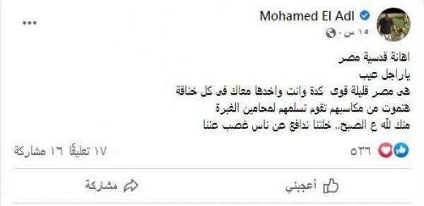 وكتب محمد العدل قائلاً: إهانة قدسية مصر، يا راجل عيب، هي مصر قليلة قوي كده وأنت واخدها معاك في كل خناقة، هتموت من مكاسبهم تقوم تسلمهم لمحامين الغبرة، منك لله ع الصبح، خلتنا ندافع عن ناس غصب عننا".