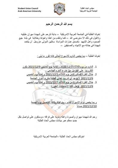 وفيما يلي بيان مجلس اتحاد الطلبة في الجامعة العربية الأمريكية: