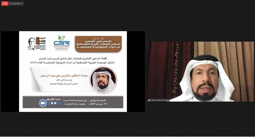 وجرى خلال الحفل تكريم منيب المصري بجائزة التميز الدولية في مجال المسؤولية المجتمعية لعام 2021 الشبكة الإقليمية للمسؤولية المجتمعية وعرض فيلم " منيب المصري .. قائد التمكين التنموي لمدينة القدس".