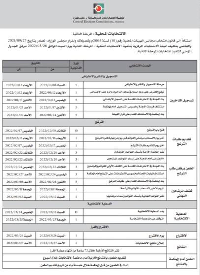 أعلنت لجنة الانتخابات المركزية اليوم الإثنين، جدول المدد القانونية للانتخابات المحلية- المرحلة الثانية، وذلك وفقاً لقرار مجلس الوزراء الصادر بتاريخ 27/9/2021 والذي يقضي بعقد المرحلة الثانية من الانتخابات يوم 26 آذار 2022، في 66 هيئة محلية في الضفة الغربية وقطاع غزة، من بينها 25 هيئة في القطاع.