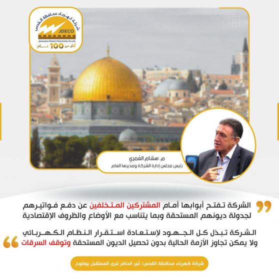 أكد رئيس مجلس إدارة شركة كهرباء محافظة القدس ومديرها العام م. هشام العُمري، أن أبواب الشركة مفتوحةٌ أمام كل من يرغب في تسوية أموره المالية والقانونية، وأن تسوية الأمور العالقة مع المشتركين ستكون بما يتناسب مع الظروف الاقتصادية للمشترك والأوضاع المالية للشركة، داعياً جمهور المشتركين إلى التوجه إلى أحد فروع الشركة لتسوية الأمور المالية والقانونية والحصول على التسهيلات التشجيعية.
